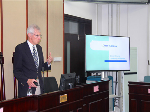 学术报告期间,Cowan Ervine教授以案例讲解的形式,在宏观层面上介绍了英国消费者权利保护存在的问题及已有的解决措施,从原告、被告、法院等不同角度具体分析了集团诉讼的利弊,并指出了集团诉讼程序设计方面的相关问题,最后得出集团诉讼只是一种解决方法的结论。