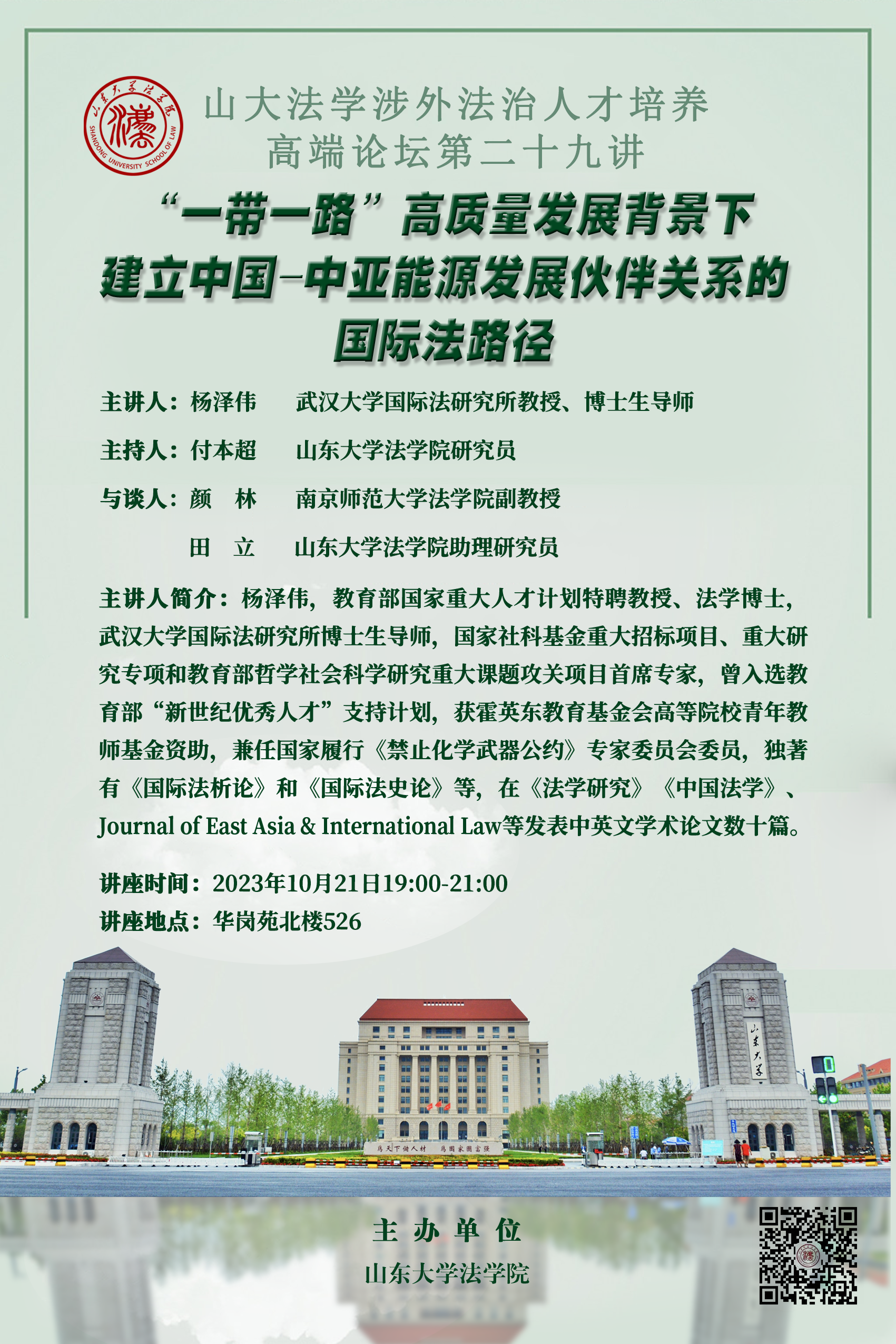 讲座预告 | 山大法学涉外法治人才培养高端论坛第二十九讲:“一带一路”高质量发展背景下建立中国-中亚能源发展伙伴关系的国际法路径