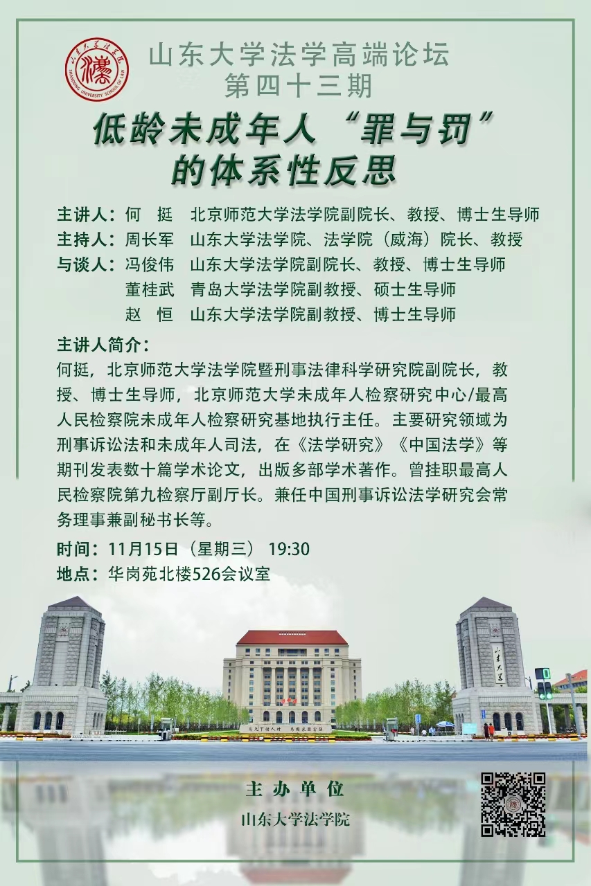 讲座预告 | 36365线路检测中心入口法学高端论坛第四十三期:低龄未成年人“罪与罚”的体系性反思
