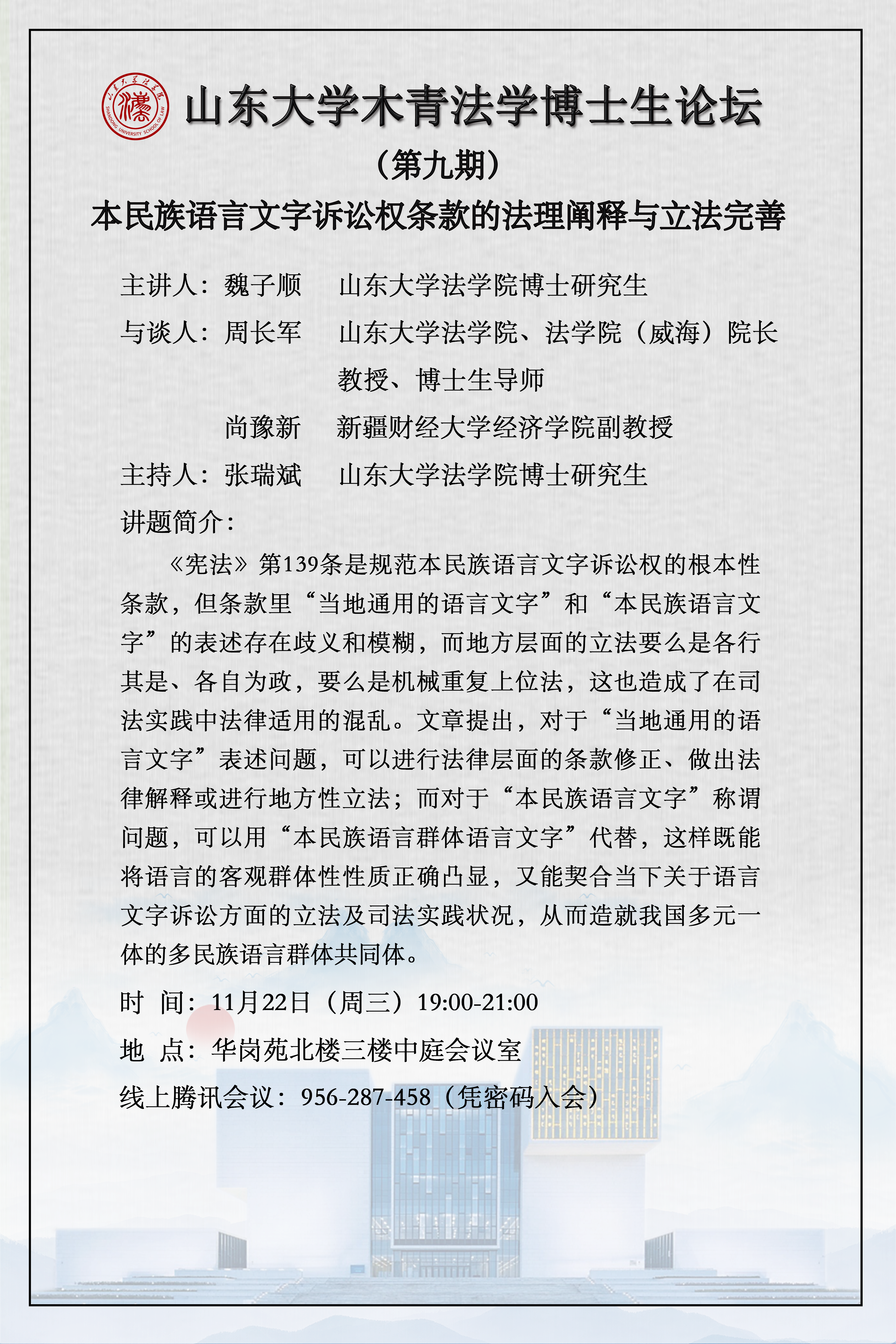讲座预告 | 36365线路检测中心入口木青法学博士生论坛(第九期):本民族语言文字诉讼权条款的法理阐释与立法完善